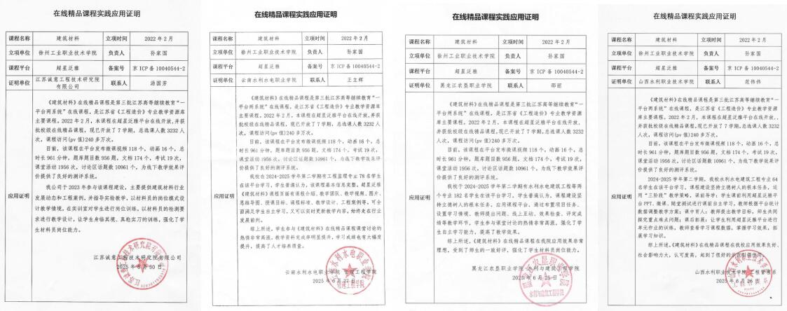 孙家国教授主编的《建筑材料与检测》教材除本校使用外,还有山西水利职业技术学院、河南水利与环境职业学院、湖南水利水电职业技术学院、重庆水利电力职业技术学院、福建水利电力职业技术学院等学校相关专业使用,使用效果反映较好。