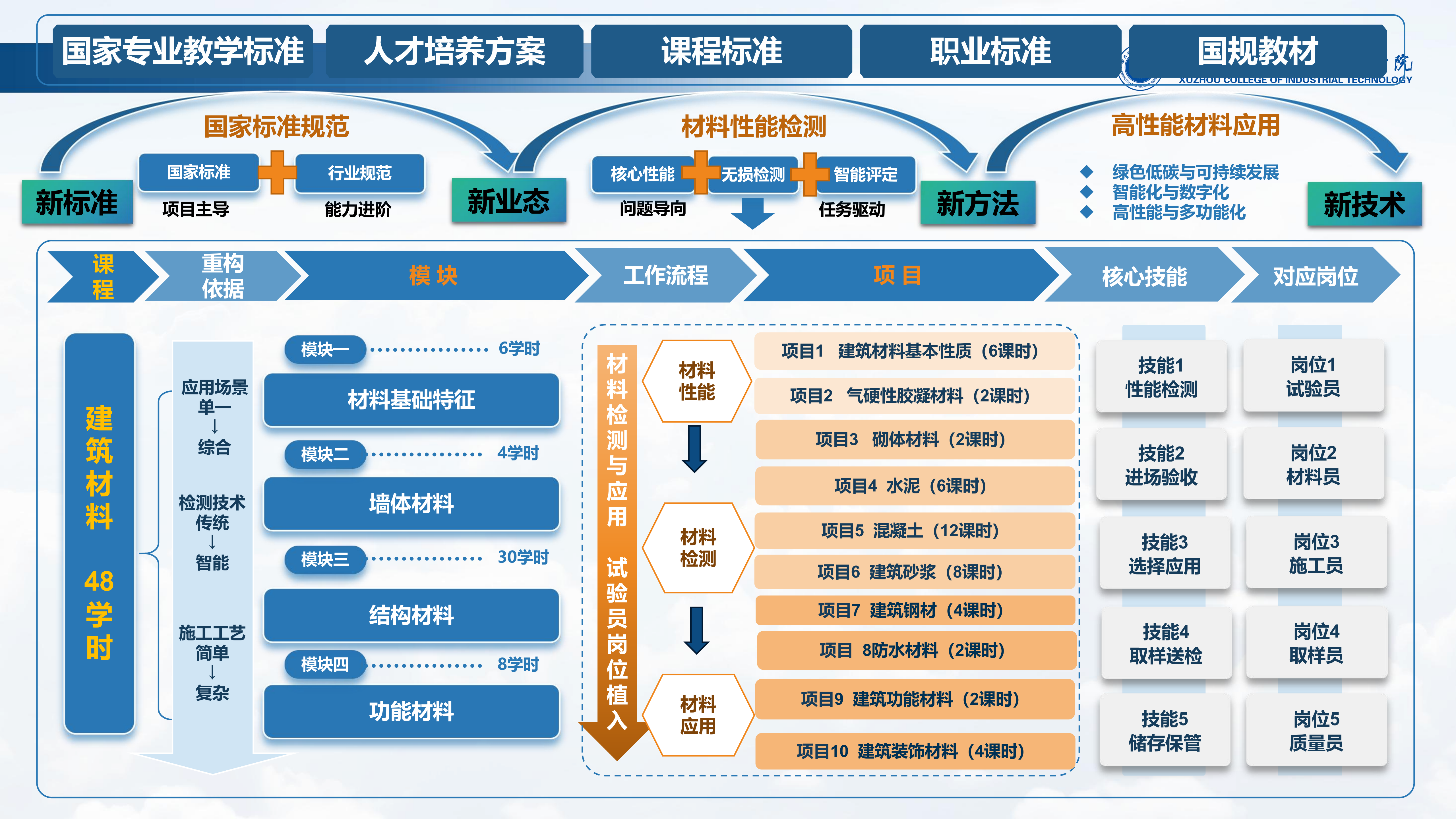 学校配备了建筑材料、结构检测、工程力学、耐久性分析等实验室,仪器设备总值600多万元,现有江苏省建筑智能防水技术与材料工程研究中心、徐州市装配式建筑新材料研发中心、徐州市土木智慧建造工程中心、徐州市海绵城市工程技术中心、徐州市屋面工程技术中心五个省、市级研究平台。2023年9月,获批校级在线精品课程立项,主编《建筑材料与检测》获批“十三五”、“十四五”职业教育国家规划教材。2019年10月,由中国建筑防水协会授予“建筑防水行业职业技能培训基地”,2020年1月,同北京东方雨虹防水技术股份有限公司成立产业学院,建立了大师工作室。2021年7月, 学院牵头成立全国建筑防水职业教育集团,积极开展产业学院治理结构与协同育人机制探索与创新,打造大师工作室中国学徒制人才培养模式;围绕建筑现代产业体系,开展新材料、新技术、新工艺科技研发和社会服务,取得了显著成效。