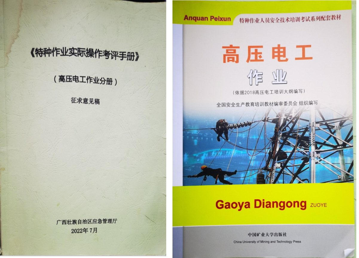 The textbooks selected are the draft for soliciting opinions on the "High Voltage Electrical Operation" organized by the National Safety Production Education and Training Textbook Compilation and Review Committee and the "Special Operation Practical Operation Evaluation Manual" (High Voltage Electrical Operation Volume) organized by the Emergency Management Department of Guangxi Zhuang Autonomous Region.