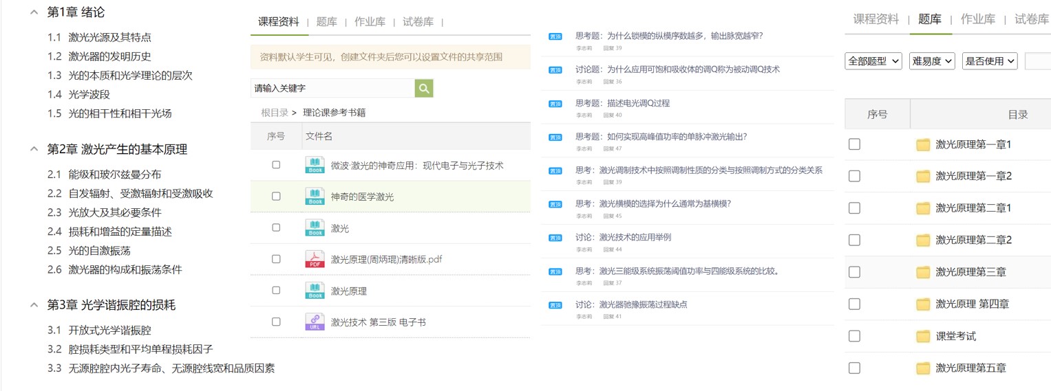 《激光原理及技术》是光电信息科学与工程专业的一门专业核心课程。激光在光纤通信、光存储、激光切割、激光雷达等方面都起着至关重要的作用,本课程的目的在于介绍激光的发展与基本原理理论知识,掌握激光器的开发和应用技术,为今后从事光电子方向和相关专业的教学和科研打下扎实的理论基础。实验课程是在理论课程授课的基础上选择部分激光原理和技术的实验内容,通过动手实践进一步加强对激光原理的理解,掌握激光器的使用技术。 课程主要内容,激光产生的基本原理,光学谐振腔的损耗,共轴球面腔的稳定性,激光模式特征和高斯光束,增益饱和及模式竞争,速率方程和激光振荡特性等。 考核方式:1.考勤+作业20%;2.课内实验:30%;3.期末考试:50% 辅导答疑安排:答疑时间:周四5-6节,地点:实验楼A505,方式:钉钉群或者学习通,微信,办公室面谈。