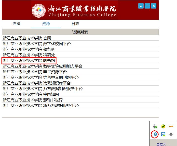 (下图红圈所示),在显示的资源列表中选图书馆,即进入图书馆门户网站,然后在图书馆门户网站电子资源模块选择数据库访问即可(后续步骤就同校内访问)。