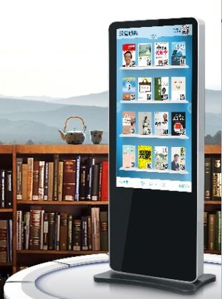 歌德借阅机,是一款硬件大屏设备,如下图。可以触摸操作。可以基于大屏直接阅读电子书、期刊、报纸,也可以使用超星的学习通、移动图书馆App扫图书的二维码下载到手机本地进行阅读。详见4.1.1节介绍。
