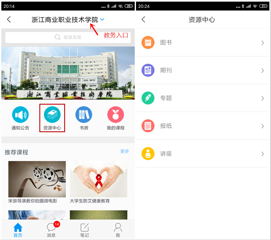 进入“教务入口”(下图左)),点“资源中心”即可浏览图书、期刊、专题、报纸、讲座等(下图右)。如从“我的课程”进入,则为在线课程的学习。从右下角“我”进入则进入个人空间。