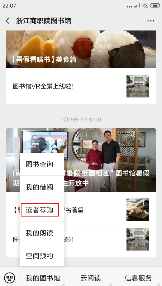 首先,访问图书馆微信公众号的“我的图书馆——读者荐购”:
