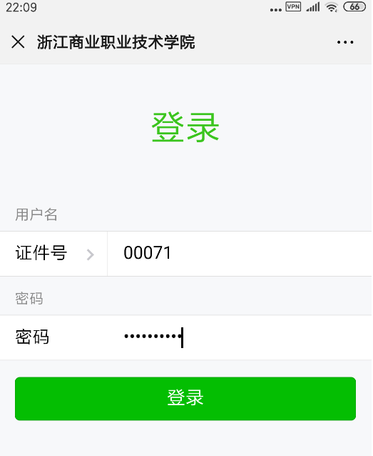 如果未绑定过身份信息,需要输入证件号(学号或工号)、密码(智慧校园系统密码,老生初始密码为ZJBC学号#,2023级开始新生初始密码 zjbc身份证末6位#)登录: