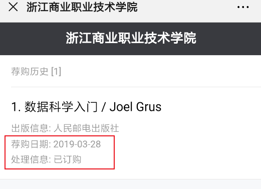 图书荐购完成后,可以在微信公众号“我的图书馆——读者荐购——我的图书馆”进入,查看荐购处理情况,如下图: