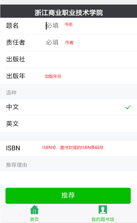 登录后,填写提交要荐购的图书信息(题名、责任者为必填信息,另外ISBN也建议填写以便工作人员快速找到你想推荐的图书,推荐理由也尽量填写):
