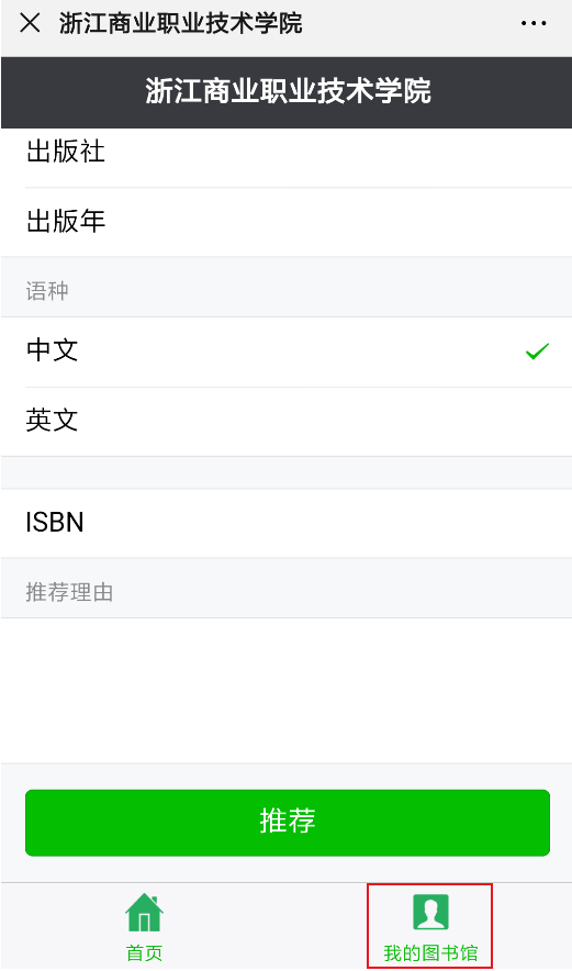 图书馆微信公众号中提供了图书荐购服务,读者可以直接填写相关推荐信息进行荐购。