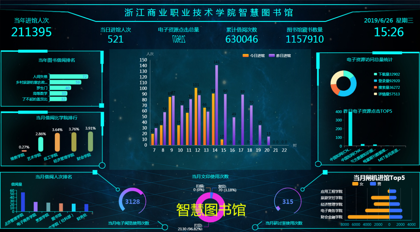 智慧图书馆模块提供图书馆运行的基本数据信息,包括馆藏、进馆人次、书籍借阅情况、空间利用数据等。