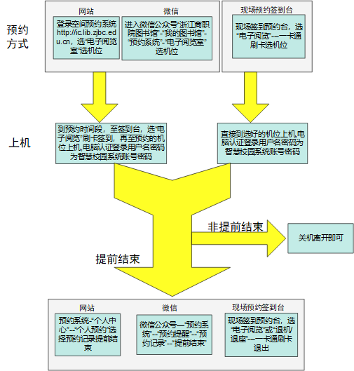 在网站或微信端预约了电脑,到预约的时间段必须先到现场签到预约台刷卡签到(选“电子阅览”刷卡即提示签到成功)确认你的到场,否则系统认为你未到场使用,会产生违约记录!未在网站、微信预约的,在现场签到预约台可直接刷卡选机位,选完即签到成功,可以直接使用电脑。