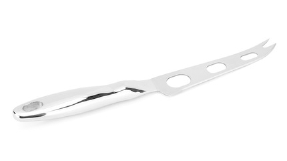 | 奶酪刀 Cheese knife ▆ 用来切奶酪的器具,刀身的洞有大有小,是为了减低刀身和奶酪的接触面积,以此降低摩擦力,刀尖翘翘的弧度呈现叉型,可以保持一刀切下,奶酪的形状干净利落,还可以把刀尖当成叉子实用。 |