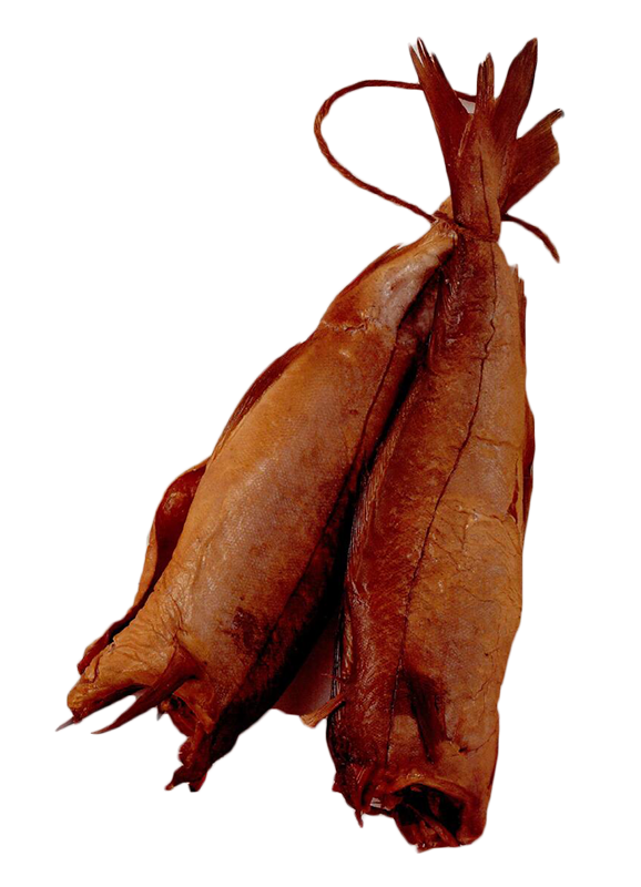 | 阿布洛斯烟熏黑线鳕 ▆ 将小黑线鳕的头和内脏去除,然后成对捆扎起来高温烟熏。通常用黄油刷涂后放入烤箱后趁热食用。 注释:高温烟熏的意思是鱼可以直接食用。低温烟熏在较低温度下进行,因此鱼实际上没熟,只是调味而已,在食用前需要进一步烹饪——三文鱼除外,它是低温烟熏的,却可以生食。 |
