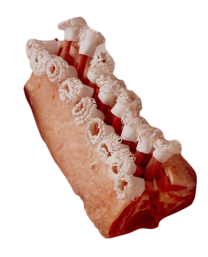 | 剥皮去毛的羊脊肉 ▆ 去掉所有骨头和腹油备用,修整,保留羊肾。是大型晚宴的一种优质大块烧烤羊肉。 |