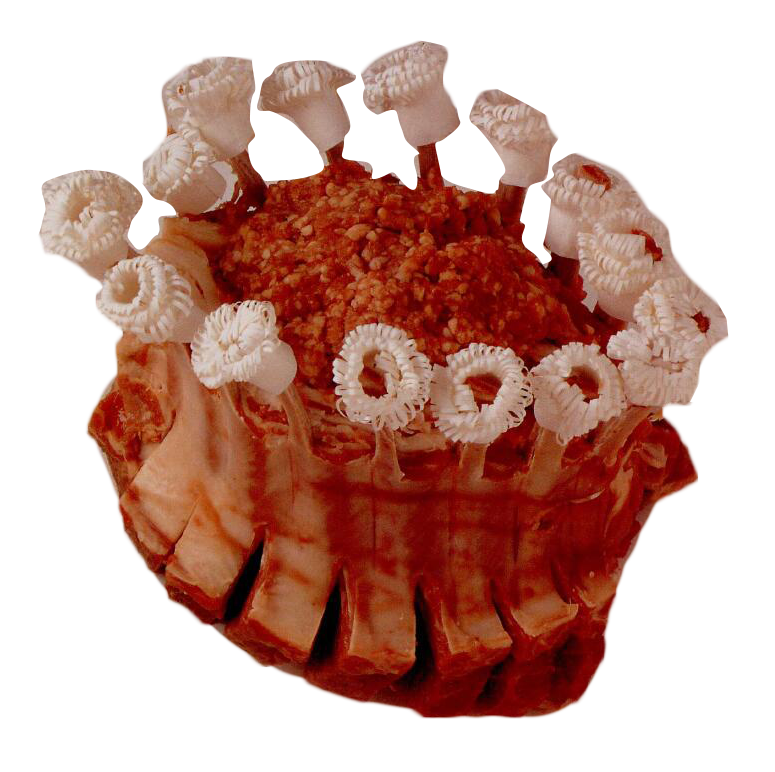 ![]() | 环形小排羊肉 ▆ 包括颈部肉片的两长条羊腰肉,用法式方法进行修整, 骨头外露。骨架由内到外扭弯,捆扎成皇冠形。烧烤前常往洞里填馅。 |