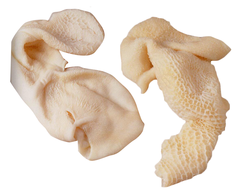 ![]() | 肚 ▆ 第一个和第二个胃之间的组织,通常是牛肚。选购新鲜的白色至乳黄色的肚。蜂窝状肚(右图)被认为是上品。大多数肉贩把牛肚煮熟,以缩短家庭烹饪时间。毯状牛肚(左图)烹饪时间长而不解体。水煮、烤串、炒、油炸或者做成砂锅 |