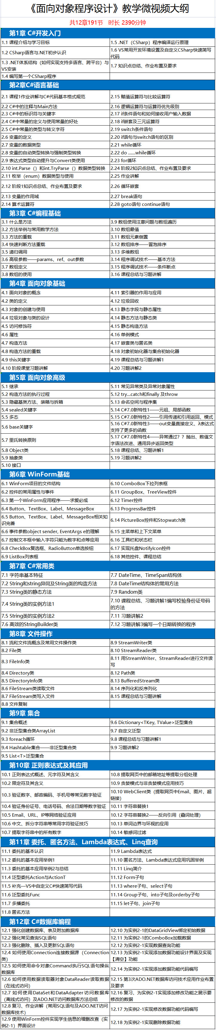 《面向对象程序设计》课程是面向对象开发的基础,属面向对象开发初级课程,本课程选用C#语言。 后续课程有ASP.NET动态网页设计(中级课程)、基于.Net企业级开发(高级课程)。同时也是JSP程序设计、PHP程序设计等的重要基础课程。 学习目标:熟练掌握C#基本知识(基本功)、领悟面向对象开发思想、具备WinForm应用程序开发基本能力、为利用.NET平台开发(后续课程学习)奠定坚实基础。 抓住面向对象的核心概念、C#的精髓,从初学者角度、循序渐进,以通俗易懂的语言、丰富多彩的实例,详细讲解使用面向对象C#语言进行程序开发时应该掌握的各种知识技能。(以Visual studio2017为编程环境——新)