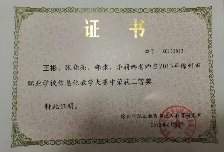 2013年6月,2013年徐州市信息化教学大赛二等奖 (市级)