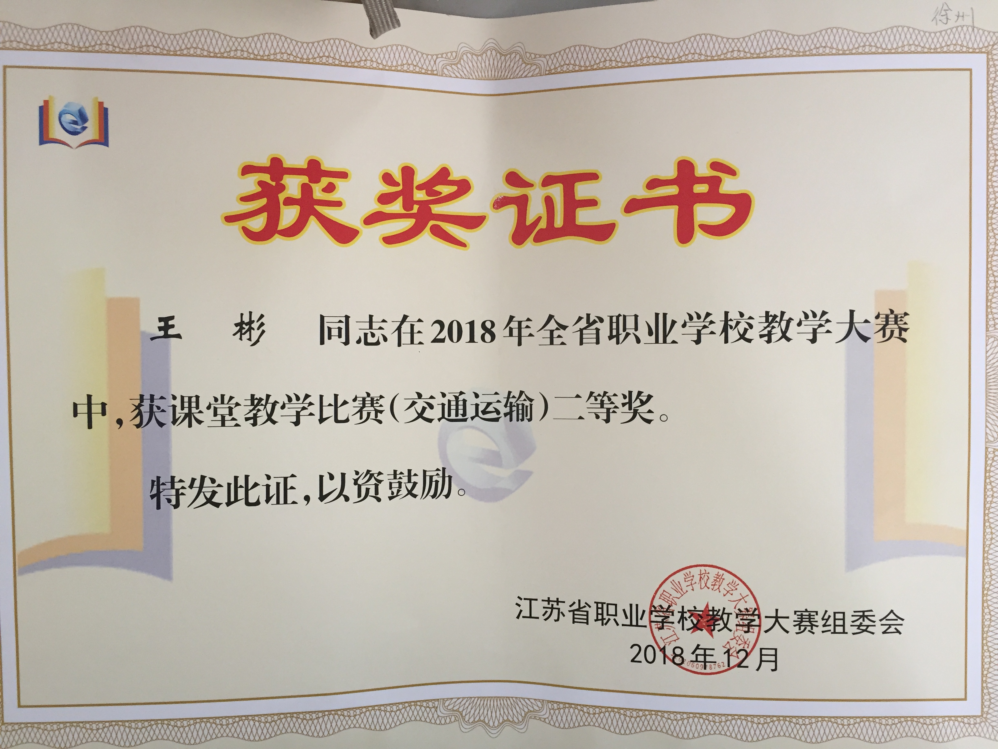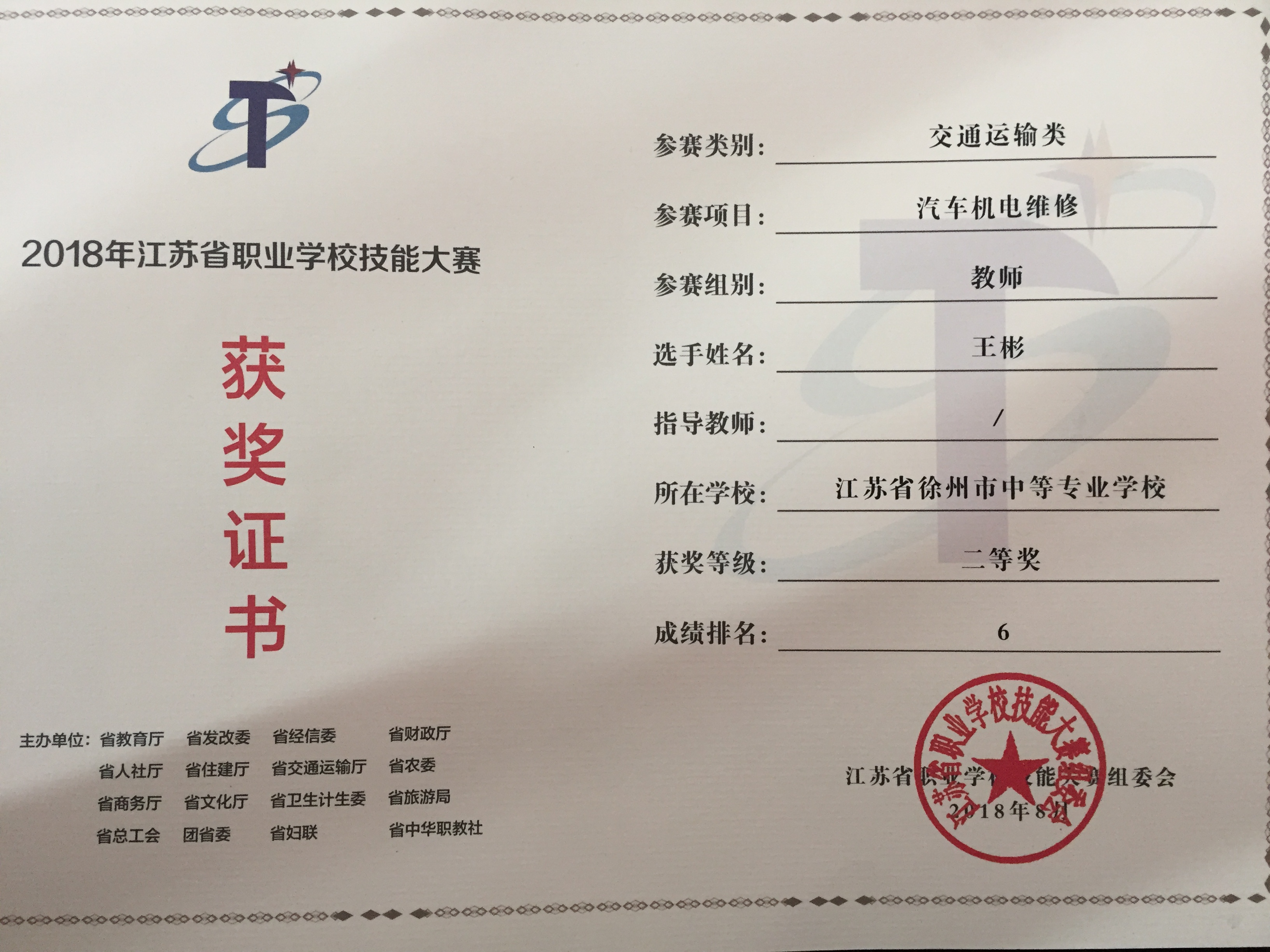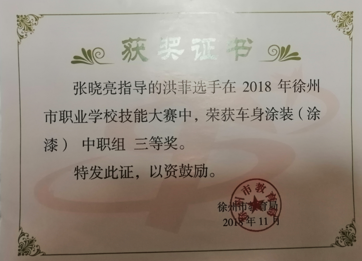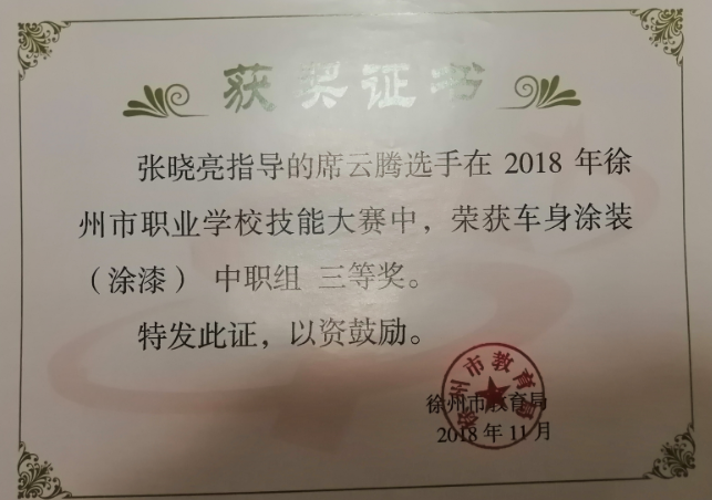 1、2018年11月,徐州市职业学校技能大赛,指导卢家程获车身涂装项目高职组一等奖 (市级)