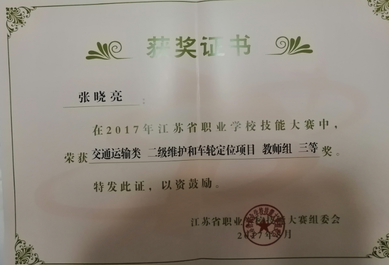 5、2017年8月,江苏省职业学校技能大赛二级维护教师组三等奖 (省级)