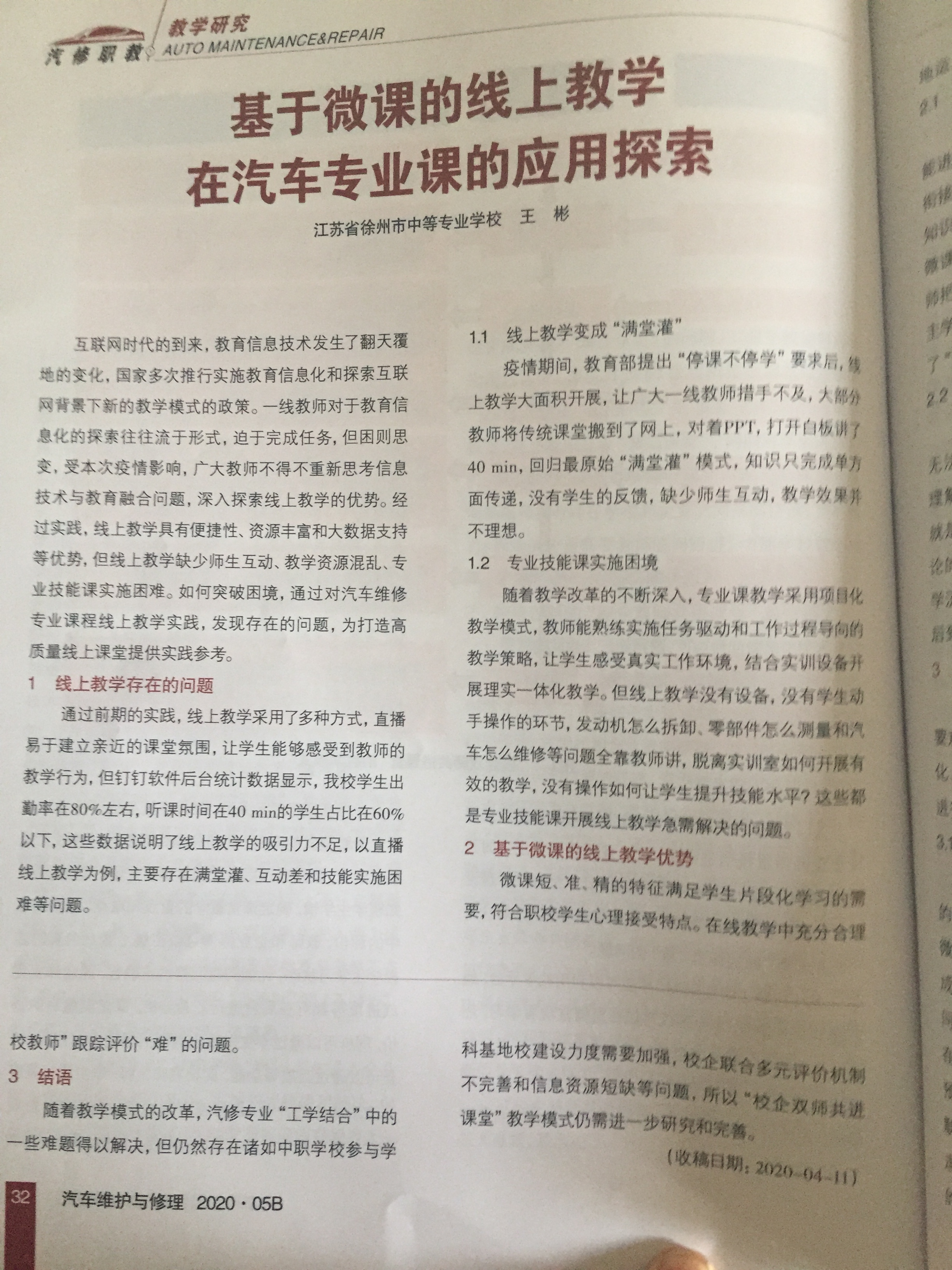 1. 基于微课的线上教学在汽车专业课应用探索(王彬2020.05)