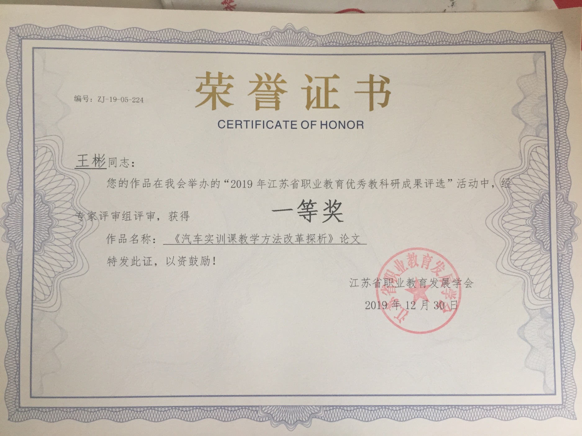 2019年获江苏省技术能手称号;