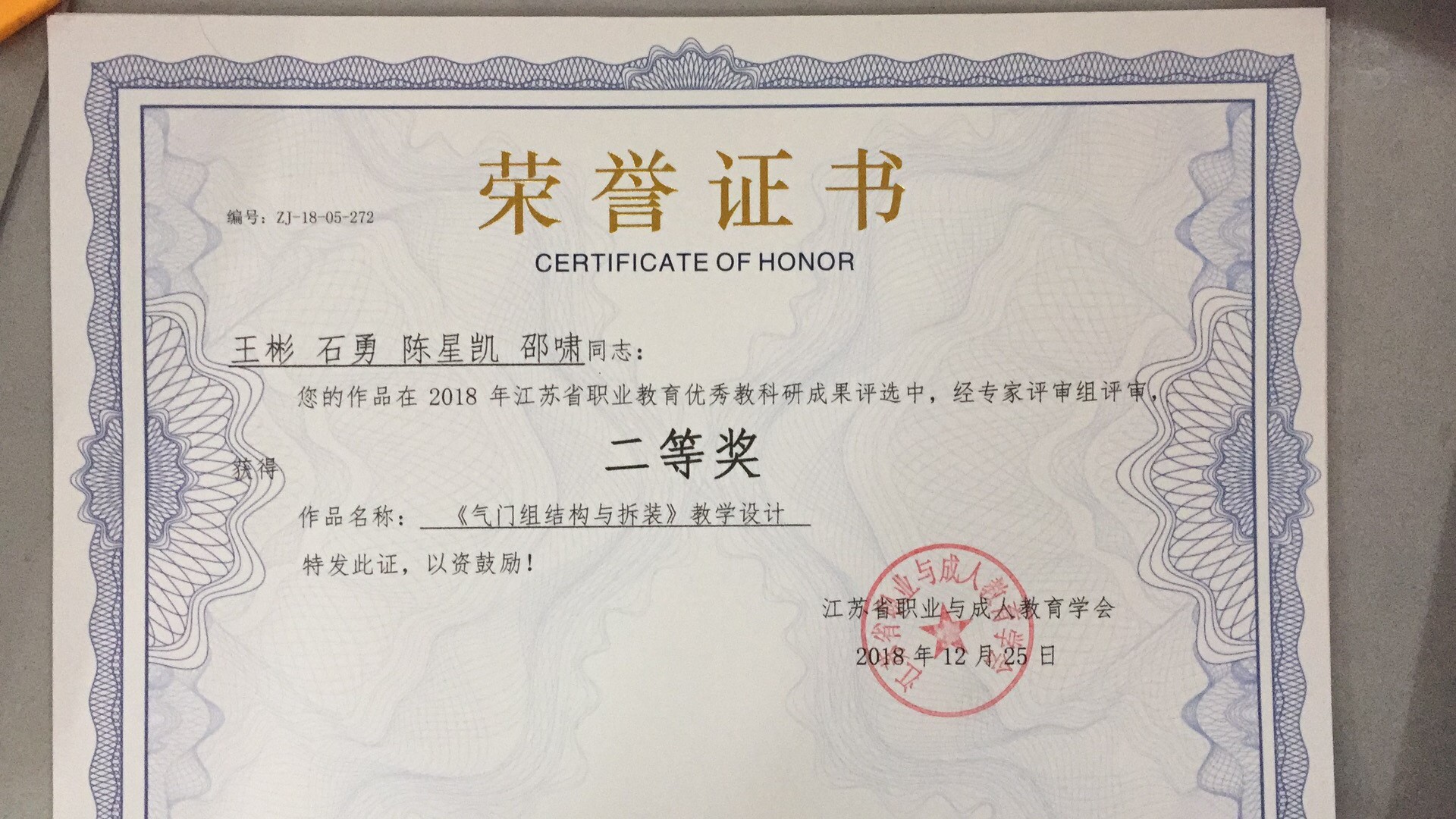 3.2018年省职业教学成果评比二等奖(《气门组结构与拆装》教学设计(王彬,石勇,陈星凯)