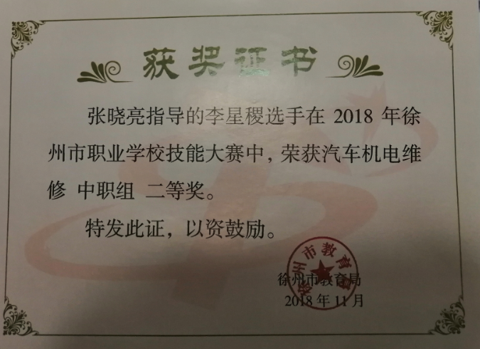 2019年徐州市技能大赛汽车维修赛项三等奖。
