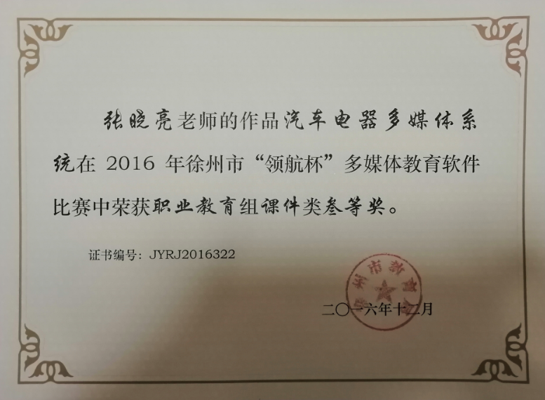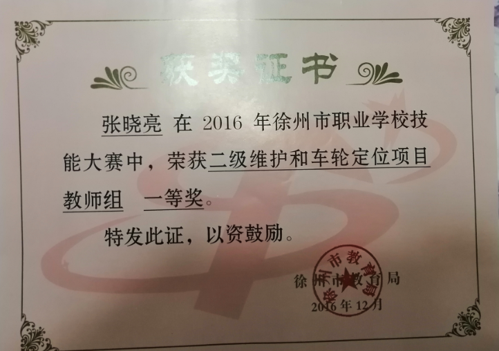 2016年徐州市技能大赛汽车空调维修项目二等奖,指导学生获得市汽车空调赛项一等奖。