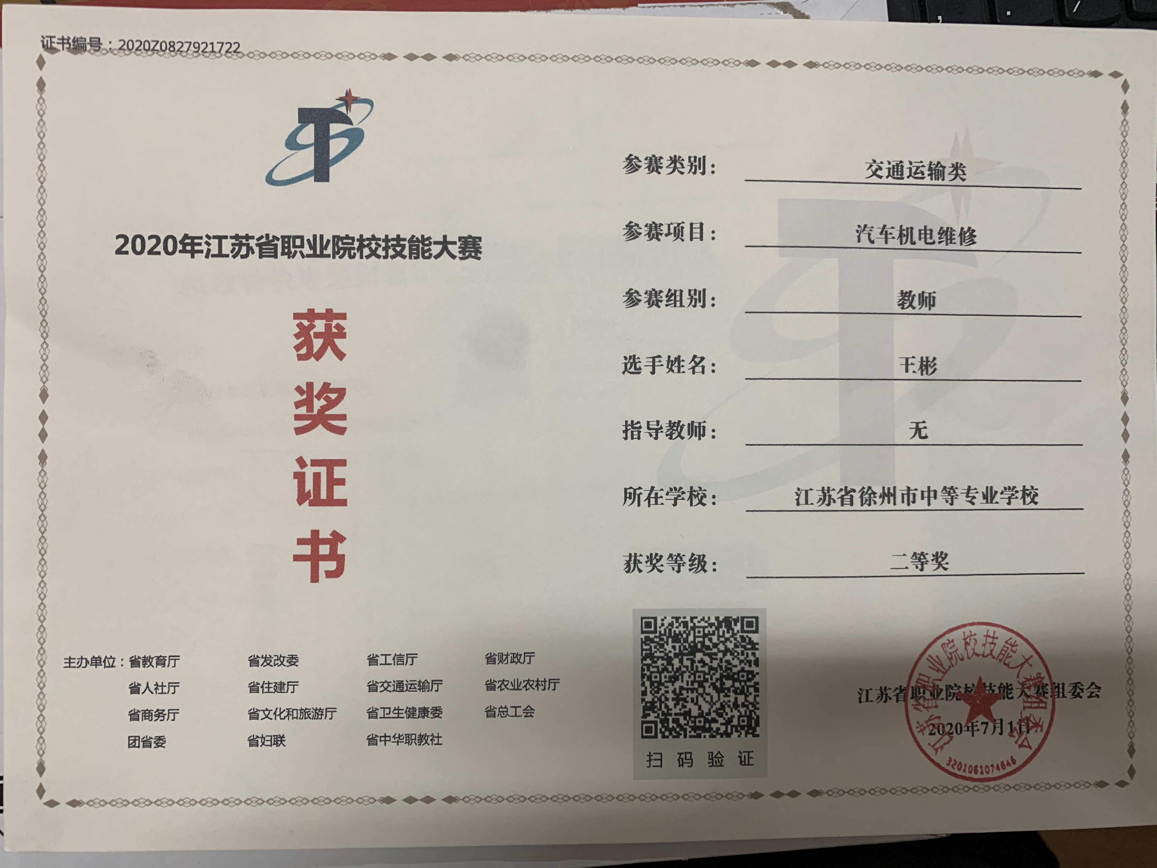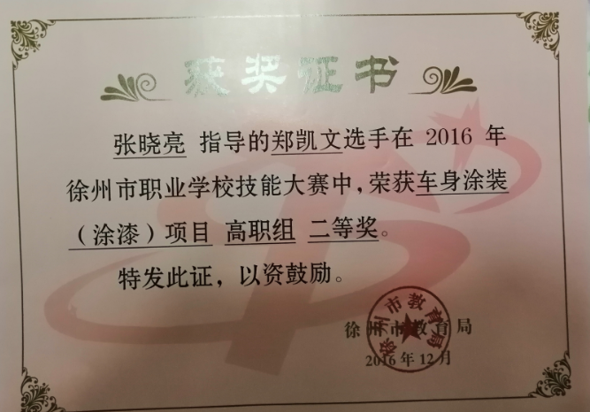 1、2016年12月,徐州市职业学校技能大赛,指导郑凯文获车身涂装项目高职组二等奖 (市级)