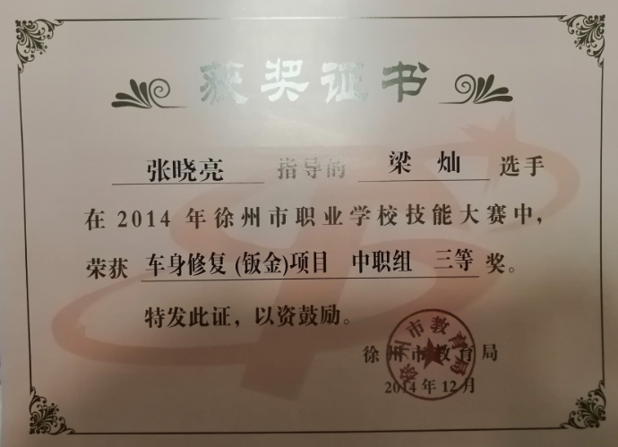 1、2014年12月,徐州市职业学校技能大赛,指导梁灿获车身修复项目三等奖 (市级)