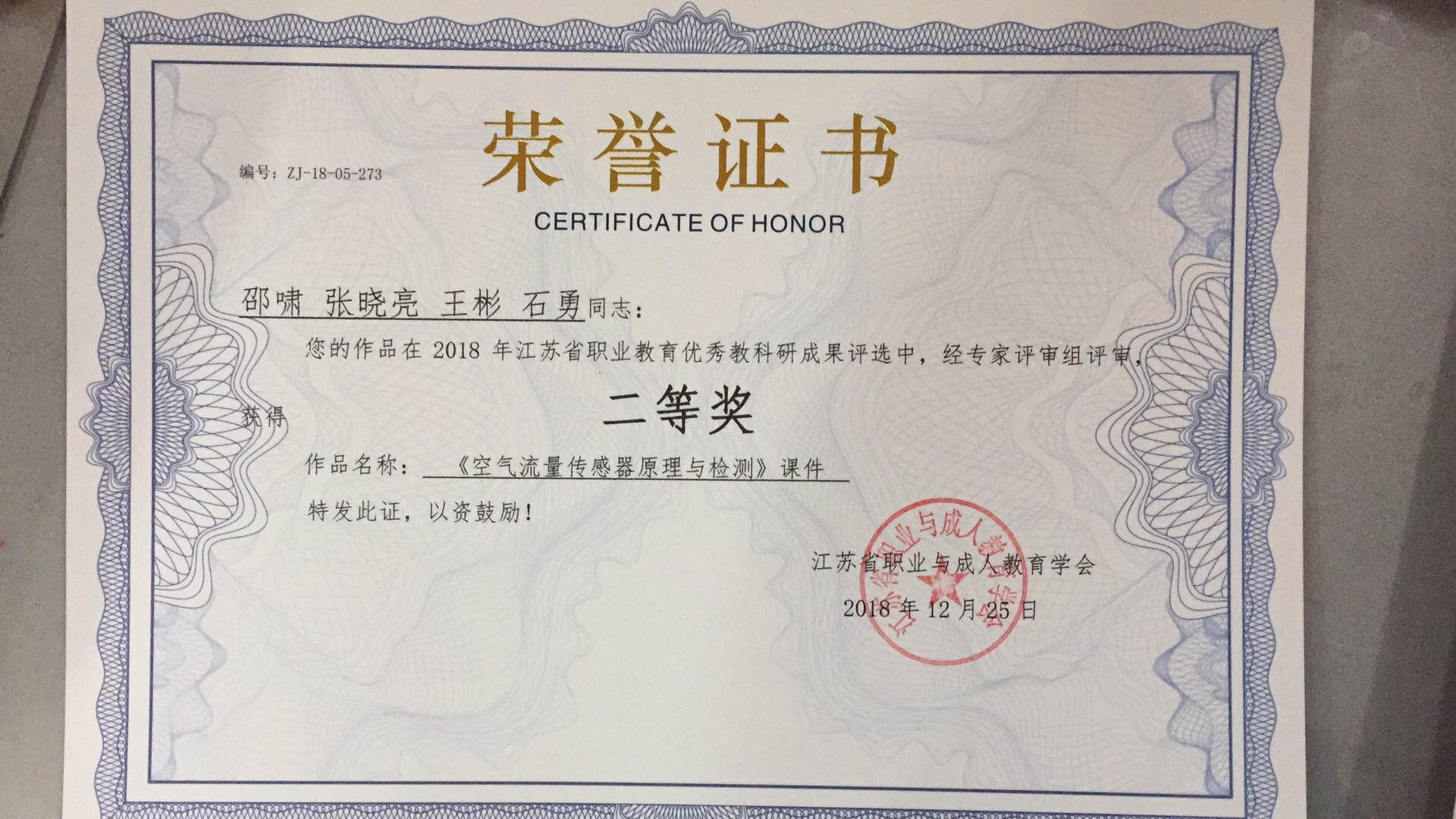 5.2018年省职业教学成果评比二等奖(《空气流量传感器原理与检测》课件(邵啸,张晓亮,王彬,石勇)