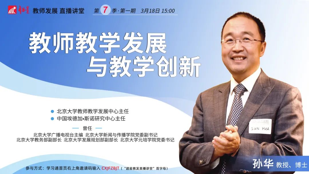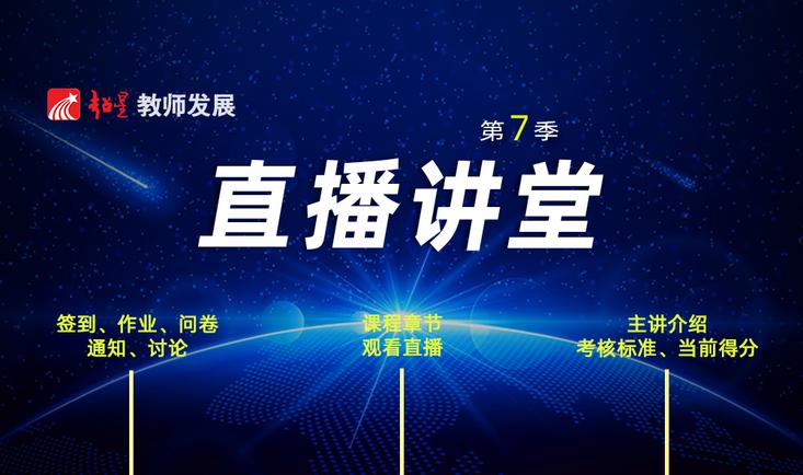 第七季直播讲堂 “推动教学创新 促进教学与技术融合”。 为深入落实全国教育大会精神、新时代全国高校本科教育工作会议精神和《中国教育现代化2035》,落实立德树人根本任务,聚焦教学创新促进教学革命,引导高校教师潜心育人,形成卓越教学的价值追求和自觉行动,全力推进高等教育“质量革命”;加快信息化时代教育变革,利用信息技术加快人才培养模式变革,实现规模化教育与个性化教育的有机结合。超星教师发展中心研究院将在2021年春季学期开启第七季直播讲堂,聚合全国名师,助力教师发展。 3月18日(周四)为第一期,6月10日完结,共13期。