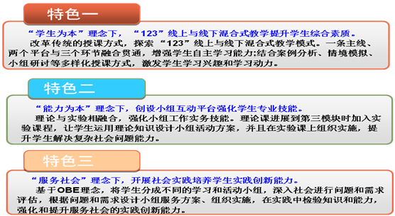 课程目标3:采用小组研讨、案例分析、情境模拟、角色扮演等多元化教学方式,通过线上与线下融合互补、理论与实验有机衔接、课堂学习与课外实践结合等多种手段,训练和提升学生的小组工作能力,使学生能够灵活运用小组工作方法开展专业服务,特别是使学生适应社会需求,具备开展养老服务与管理工作、企业社会工作或医务社会工作的能力。