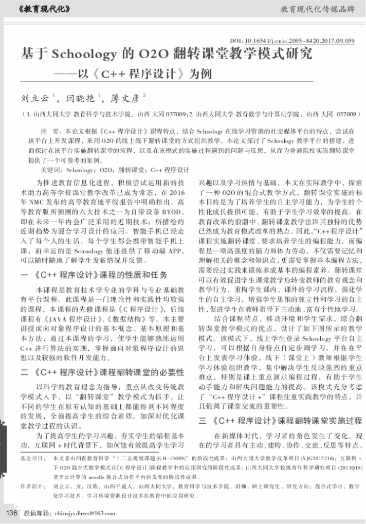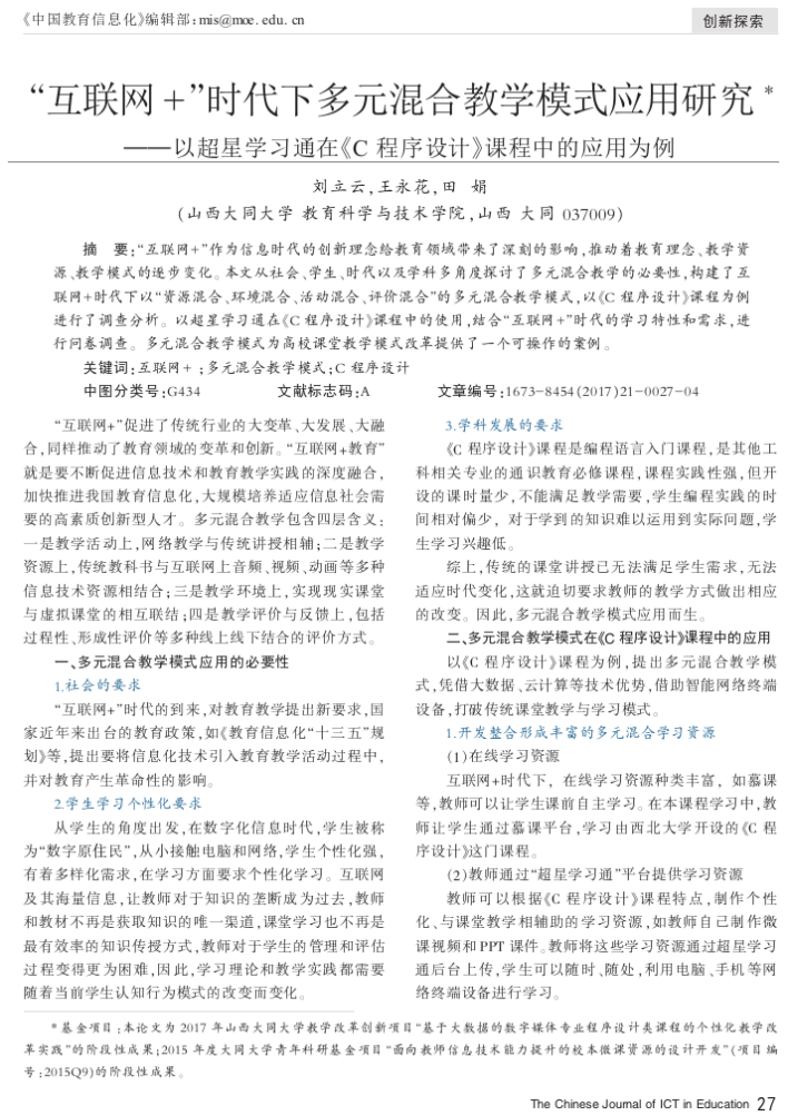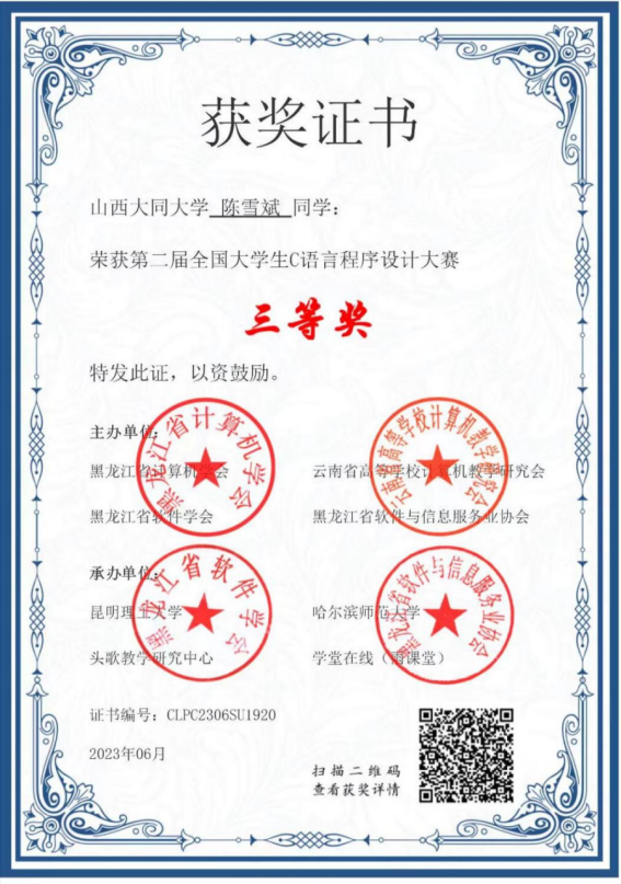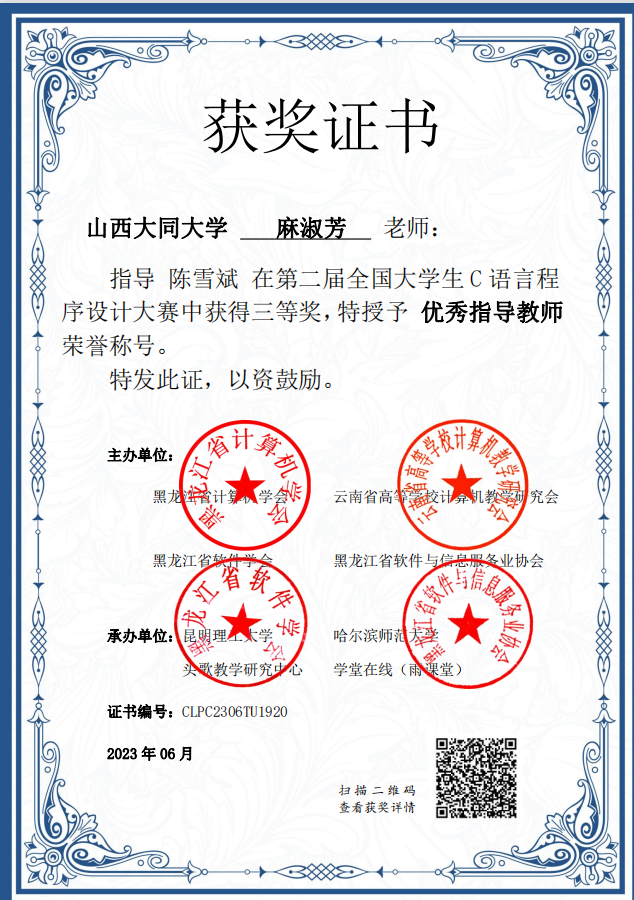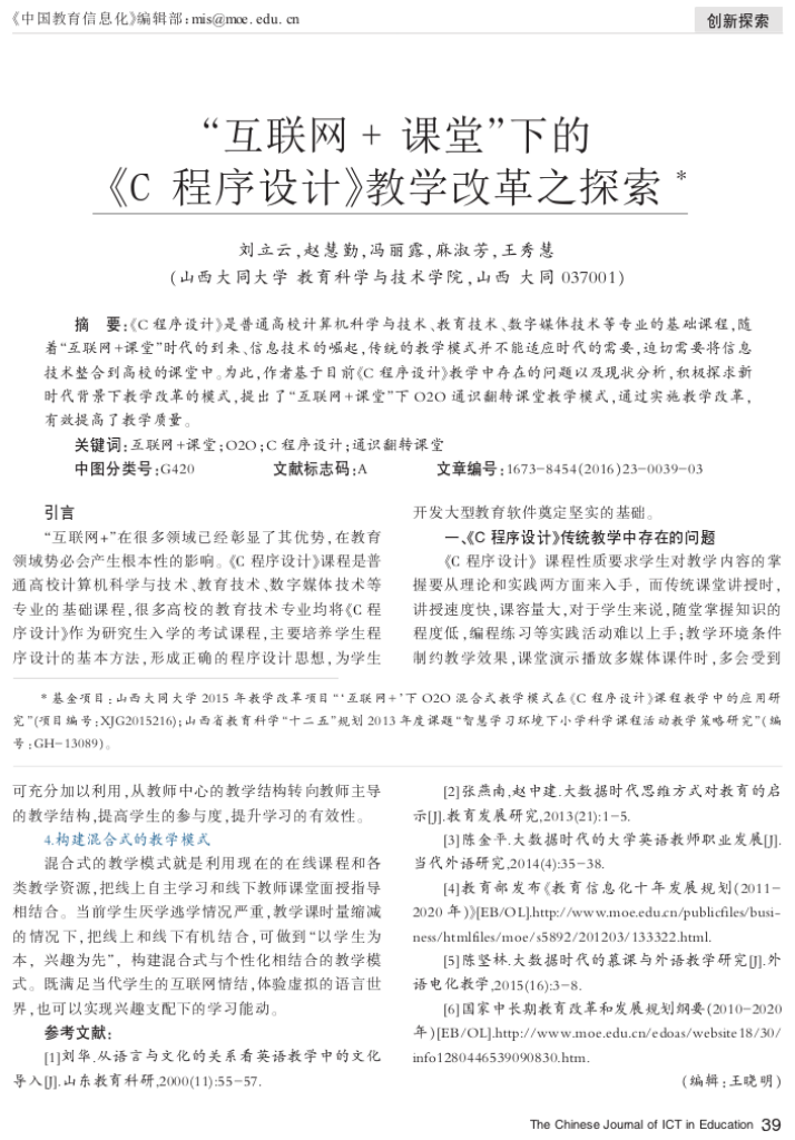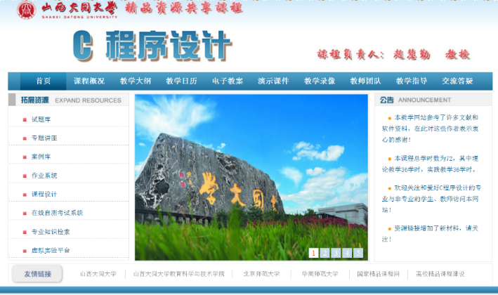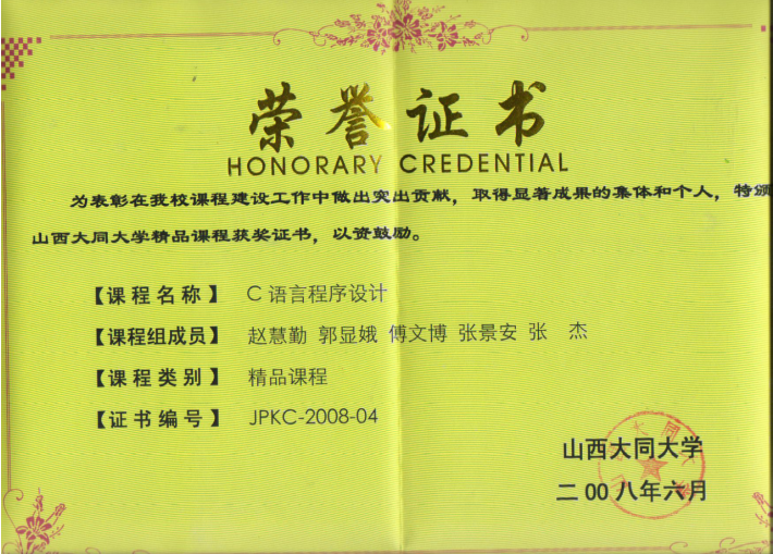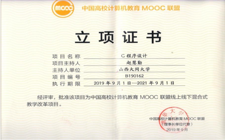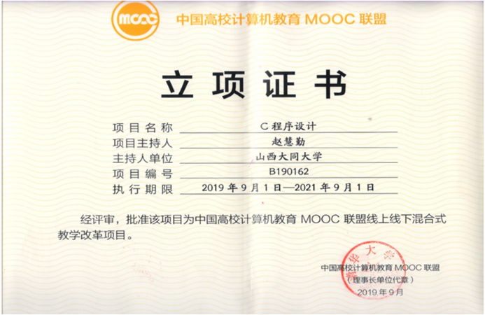 《C程序设计》是我校教育技术学和数字媒体技术专业的学科基础教育平台必修课程,在大学本科一年级第二学期开设,4学分,96学时,共16周,每周2学时的课堂理论教学,2学时的课堂实验教学,1学时的线上课前预习,1学时的线上课后提升,是一门理论性和实践性较强的课程,2008年评为校级精品课程,2014年评为校级精品资源共享课程,2017年3月起实施线上线下混合式教学改革,2019年评为山西省精品共享建设课程,同年教学成果“多元混合教学模式在地方院校计算机类课程的实践探索”获省二等奖并申报成功中国高校计算机教育MOOC联盟“CMOOC联盟线上线下混合式教学改革项目”,2021年获批山西省一流认定课程,同时开始参与由昆明理工大学方娇莉教授牵头建设的《C程序设计》虚拟教研室,一同创办“全国大学生C语言程序设计大赛”,以赛促学,进一步提高教学质量。