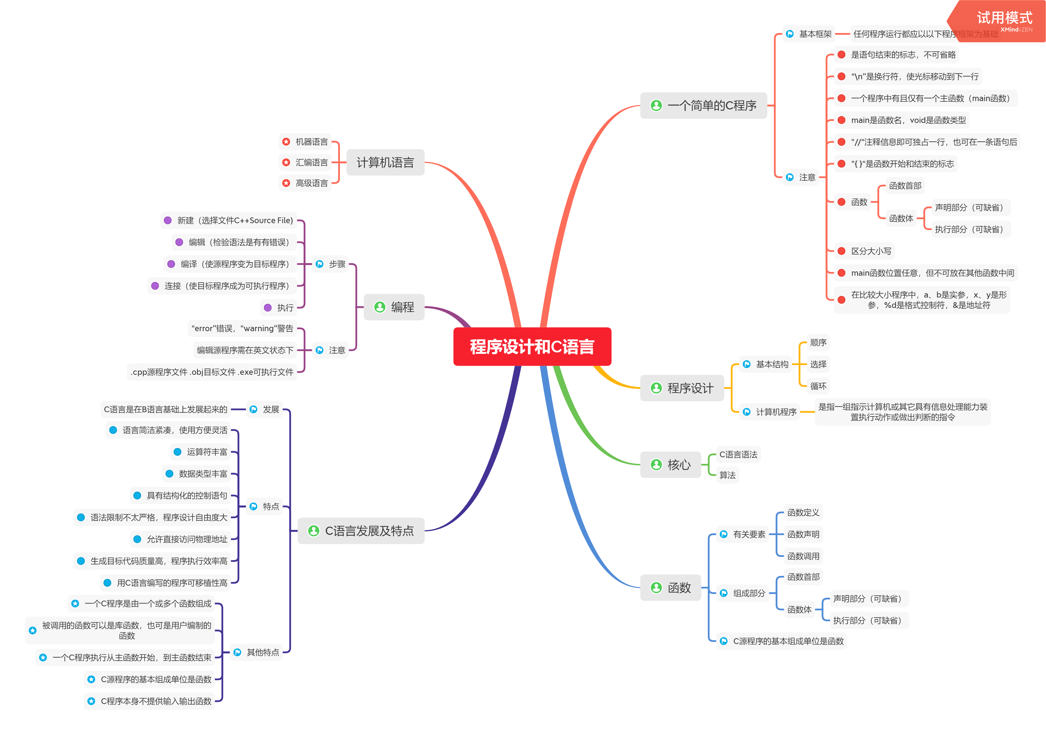 本课程内容由理论与实验两部分构成,理论部分又分为基础理论和程序设计方法两部分,其中,基础理论部分主要包括C语言基本概念、基本语法、使用规则、数据存储;程序设计方法部分包括三种结构化程序设计方法及自顶向下逐步细化的模块化设计思想。实验部分分为基础性、综合性、设计性、创新性和研究性五种实验类型,覆盖了程序设计方法的全部内容。