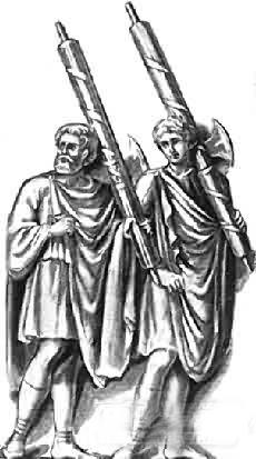 古代罗马共和国时期的最高行政长官,有12个卫士相随。他们各手执一束棍棒,束棒中间插有一把战斧——象征着罗马国家的最高权力。棒子用于施行笞刑,斧子用来执行死刑。“束棒”在古罗马人使用的拉丁语中,读作 “法西斯”。法西斯主义一词就由此而来,法西斯的本义就是高度的统一意志和暴力权威。