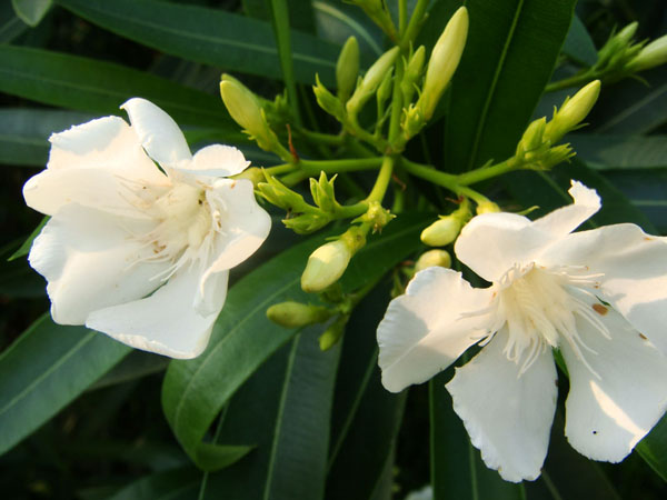 夹竹桃又名柳叶桃,有毒,含有强心毒甙,夹竹桃作用与洋地黄同,燥的3克就能使人死亡。主要表现为洋地黄中毒症状。(1)恶心、呕吐、腹痛、腹泻;(2)心律紊乱、心跳缓慢、不规则,最后出现室颤、晕厥、抽搐、昏迷、或心动过速、异位心律,死于循环衰竭。
