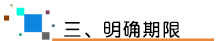 第二:这个期限也是要合理的,能保证我们拿到成果的品质,如果我们只追求速度而忘了品质的话需要我们重新返工就得不偿失了。但同时还要保证我们设定的期限是有挑战的,保证他的工作效率,效率和期限是成对应关系的。