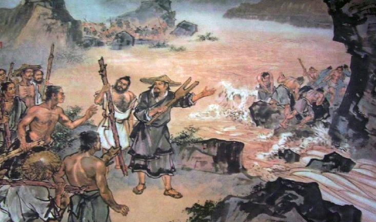 大禹率领民众,与自然灾害中的洪水斗争,最终获得了胜利。面对滔滔洪水,大禹从鲧治水的失败中汲取教训,改变了"堵"的办法,对洪水进行疏导,体现出他具有带领人民战胜困难的聪明才智;大禹为了治理洪水,长年在外与民众一起奋战,置个人利益于不顾,"三过家门而不入"。大禹治水13年,耗尽心血与体力,终于完成了治水的大业。