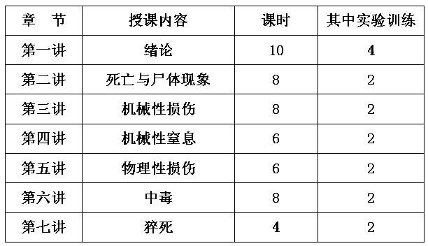 第一部分,绪论,共10课时,其中,理论教学6课时,实践教学4课时。因为学生是初学者,这里增加了人体解剖学内容,为今后学习法医知识奠定了基础。同时,增加了法医尸体检验、活体检验、物证检验等内容,这些内容在大学本科是精讲、细讲,而我们高职生,不需要精深的检验理论,但要掌握一定的检验技术,因此,这一内容概要讲解。在实训课中,我们本着实际、实用的原则,组织学生进行现场勘察、尸体检验、血型检验、年龄推断、诈病检验等,使岗位需要的知识都有、都会。