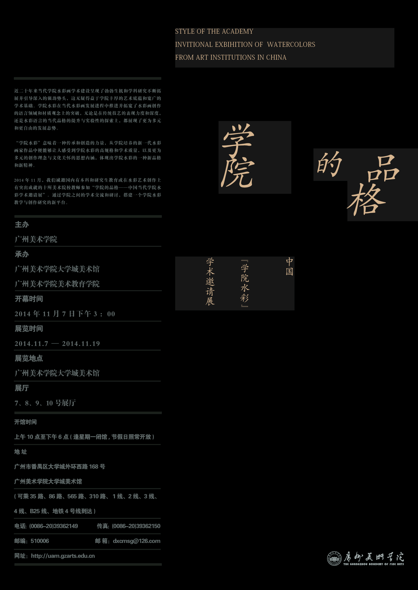 水彩专业是广州美术学院美术数育学院下属的一个非师范水彩专业。作为水彩专业的前身美术教育水彩专业,则创建于1982年广州美术学院师范系。经三十多年五、六代师生的共同努力,水彩画在学科建设中得到不断充实和壮大,在水彩教学与创作上取得了累累硕果。鉴于水彩学科在学院的专业优势和雄厚师资力量,美术教育学院于2000年设立了绘画艺术学科的非教育水彩专业,以培养水彩艺术家和水彩艺术师资队伍为目标。2010年,根据学科的发展和专业改革要求,美术教育学院龙虎院长主持并创立了水彩第一工作室和第二工作室。第一工作室以具象写实和学院传统语言研究为主,第二工作室则以拓宽和突显水性实验性艺术语言探求为研究方向和教学宗旨。