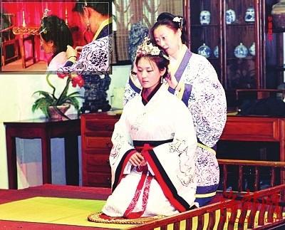 与男子的冠礼相对,女子的成年礼叫笄礼,也叫加笄,在15岁时举行,就是由女孩的家长替她把头发盘结起来,加上一根簪子;改变发式表示从此结束少女时代,可以嫁人了。