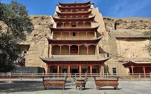 莫高窟是一座融绘画、雕塑和建筑艺术于一体,以壁画为主、塑像为辅的大型石窟寺。它的石窟形制主要有禅窟、中心塔柱窟、殿堂窟、中心佛坛窟、四壁三龛窟、大像窟、涅槃窟等。各窟大小相差甚远,最大的第16窟达268平方米,最小的第37窟高不盈尺。窟外原有木造殿宇,并有走廊、栈道等相连,现多已不存。