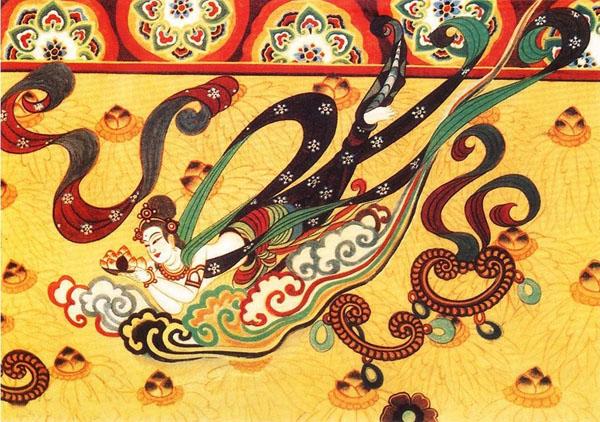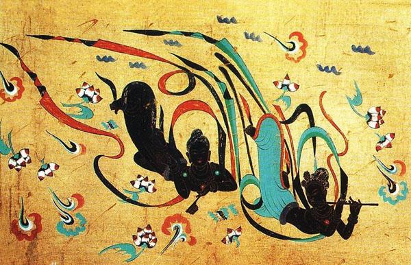 莫高窟的壁画上,处处可见漫天飞舞的美丽飞天——敦煌市的城雕也是一个反弹琵琶的飞天仙女的形象。飞天是侍奉佛陀和帝释天的神,能歌善舞。墙壁之上,飞天在无边无际的茫茫宇宙中飘舞,有的手捧莲蕾,直冲云霄;有的从空中俯冲下来,势若流星;有的穿过重楼高阁,宛如游龙;有的则随风悠悠漫卷。画家用那特有的蜿蜒曲折的长线、舒展和谐的意趣,为人们打造了一个优美而空灵的想象世界。