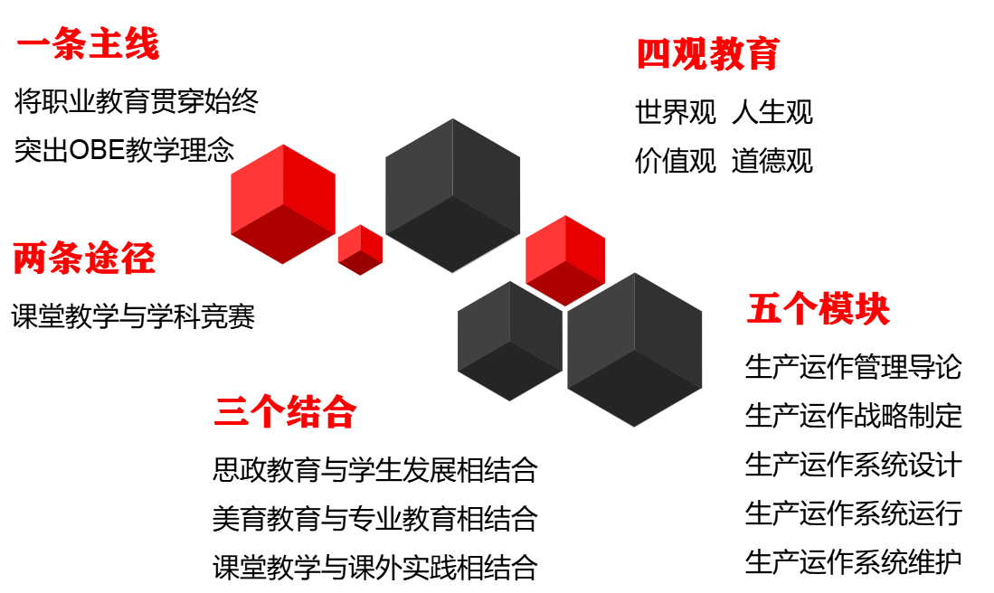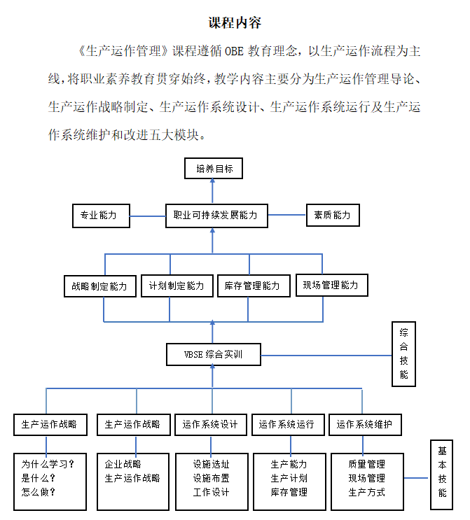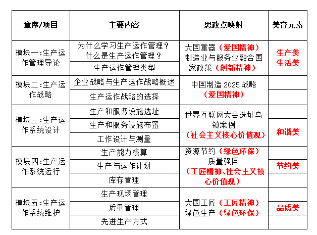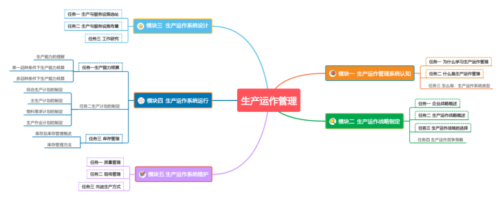 在教学中,该课程遵循OBE教育理念,以生产运作流程为主线,将职业素养教育贯穿始终,教学内容主要生产运作管理导论、生产运作战略制定、生产运作系统设计、生产运作系统运行及生产运作系统维护五大模块内容。模块一为生产运作管理导论,主要学习生产运作管理的概念、类型等基本理论知识;模块二为生产运作战略的制定,主要包括生产运作战略制定及选择知识;模块三为生产运作系统的设计,包括选址、布置及工作研究三讲内容。模块四为生产运作系统的运行,包括生产计划的制定、库存管理等主要内容;模块五为生产运作系统的维护,主要学习质量管理、生产现场管理、先进生产方式等知识,引导学生的创新思维。在整体内容选择和编排上参考了大量资料,并结合课堂教学模式改革的需要,将理论与实践有机结合,形成较为完善的课程体系。课程将帮助学习者了解生产运作管理的基本理论,熟悉和掌握生产运作中的基本模型,使学生掌握生产运作管理的基本理论及方法(懂原理、知概念);具备解决企业运营管理中复杂问题的能力,为开展创新创业奠定基础(会分析、会决策);同时以学生工匠精神培育为主,结合社会主义核心价值观的渗透,引入中国制造多种案例,培养学生的爱国情怀,激发学生为做强中国制造而努力,为我国制造业转型升级贡献力量。