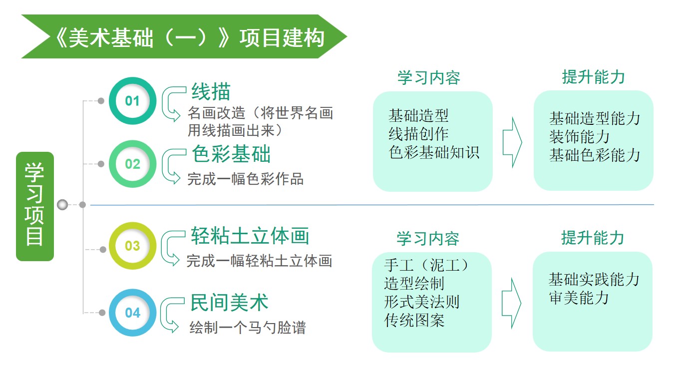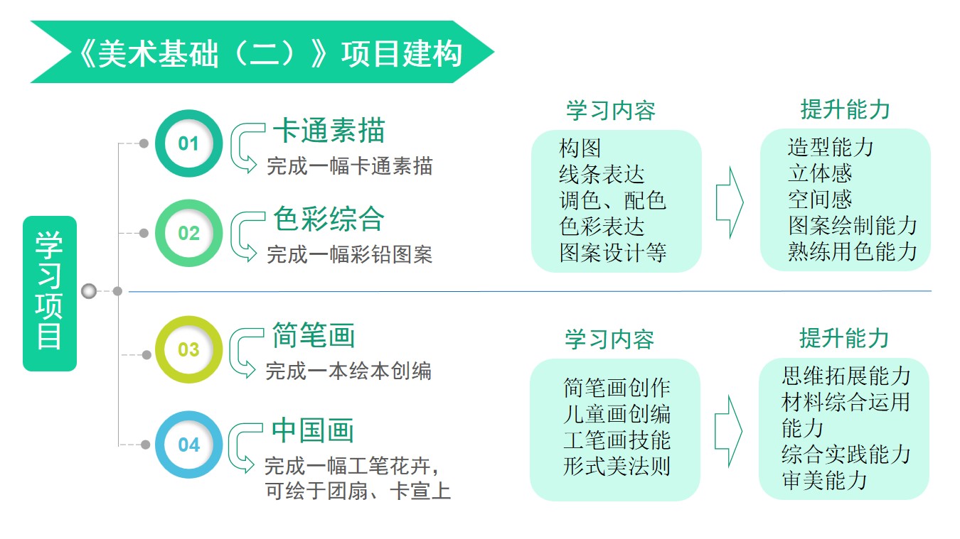 从我校学情出发,本课程的教学目标为,通过教学,学生不仅能掌握美术基础知识与技能,同时也能提升适应当下社会需求时需要掌握的新型美术材料运用能力和幼儿园环境创设、主题活动设计等综合美术应用能力。课程项目教学中所设置的卡通素描、幼儿绘本绘制、工笔花卉、工笔团扇等学习项目,将美术紧密融合学前教育专业特点,并在项目中加入我国优秀传统文化元素,培养学有所长、学有所专的具有较高审美素养的幼儿教师。| 课程章节 | | 文件类型 | | 修改时间 | | 大小 | | 备注 | |
