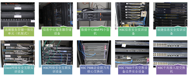 校内实训设备与实训环境 以满足实践教学环节需要为目标,以工学结合作为切入点,联合行业、企业共建本课程校内实训基地。近三年,课程组规划、建设了网络管理实训室、网络安全实训室、服务器配置与管理实训室和数据中心。我们还利用参加行业组织的相关技能大赛的机会,组建了学生工作室,其特点是精锐、齐全。各实训室条件如表1所示。 表1 校内实训室一览表