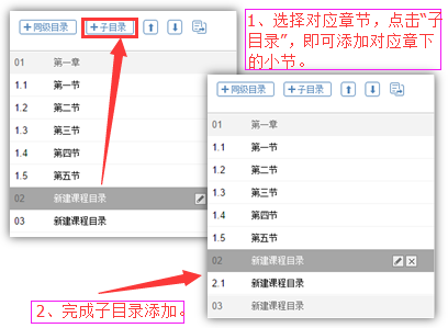 方法1:选择对应章,点击上方的“子目录”,即可依次添加章下小节。