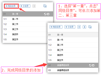 第3步:选择“第一章”,点击上方的“同级目录”。按照课程需要可依次添加第二、第三章。