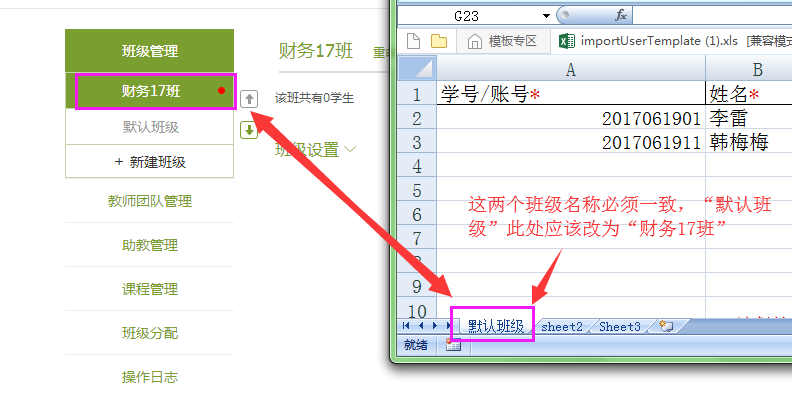 导入模版中的表名称必须与需要导入的班级名称一致。